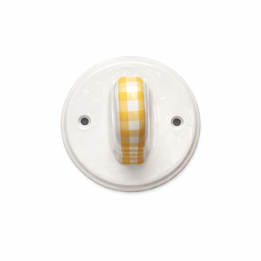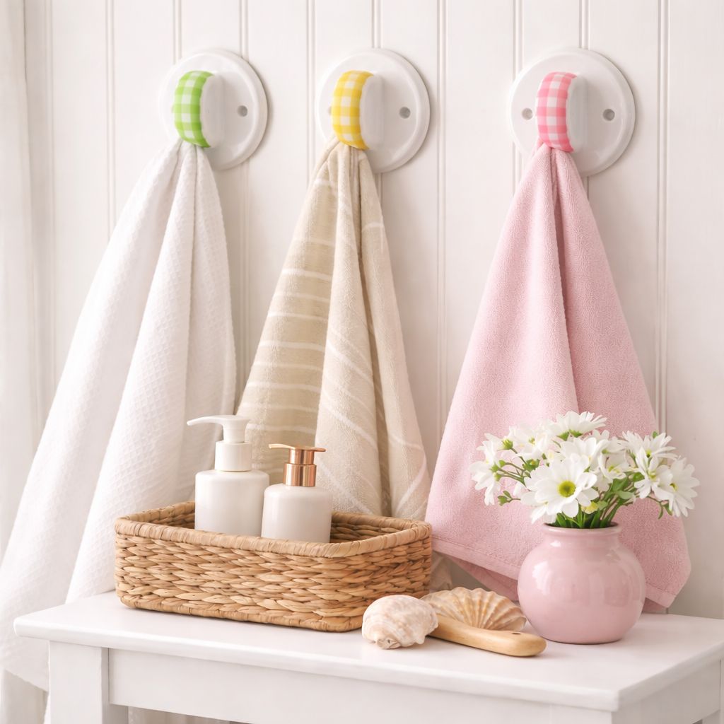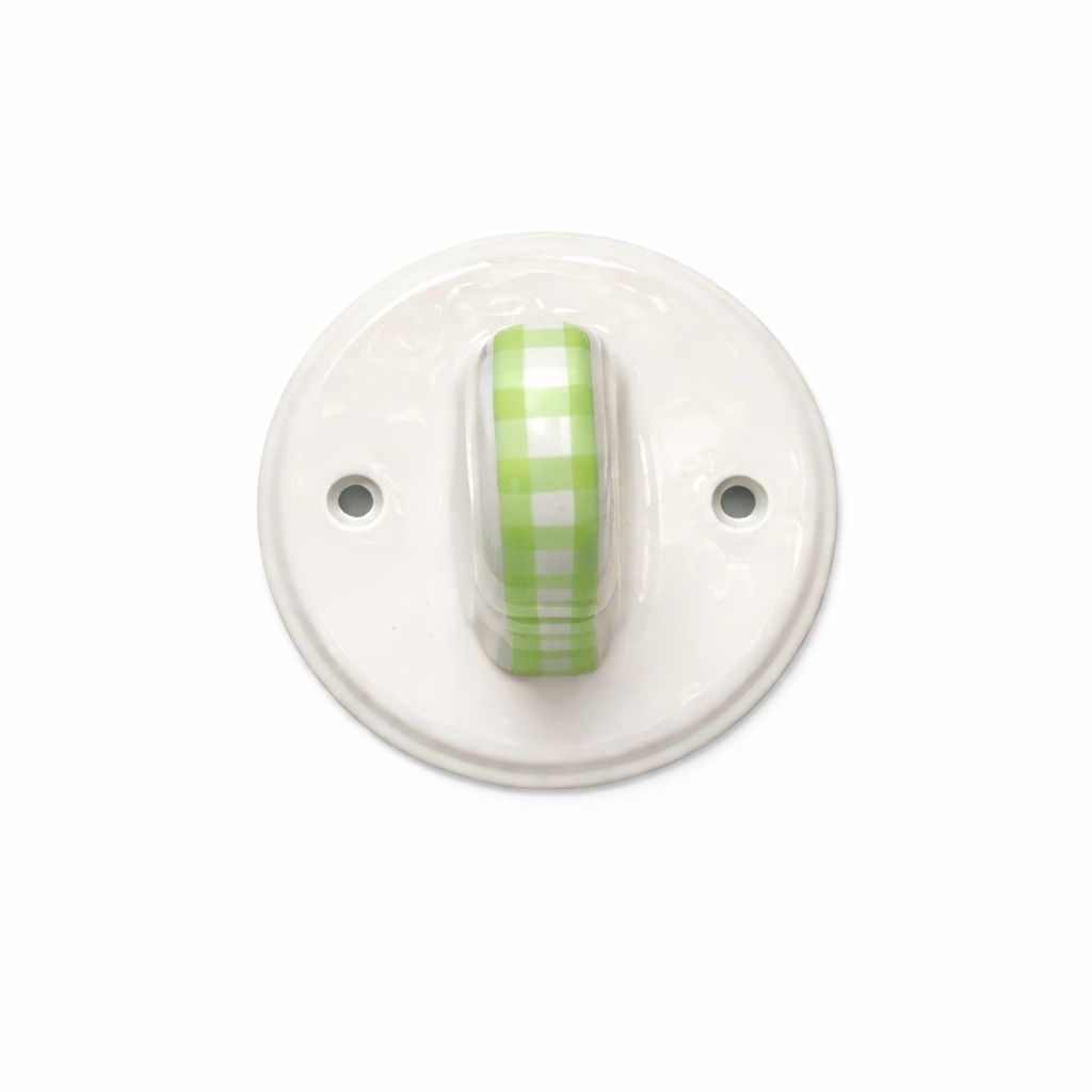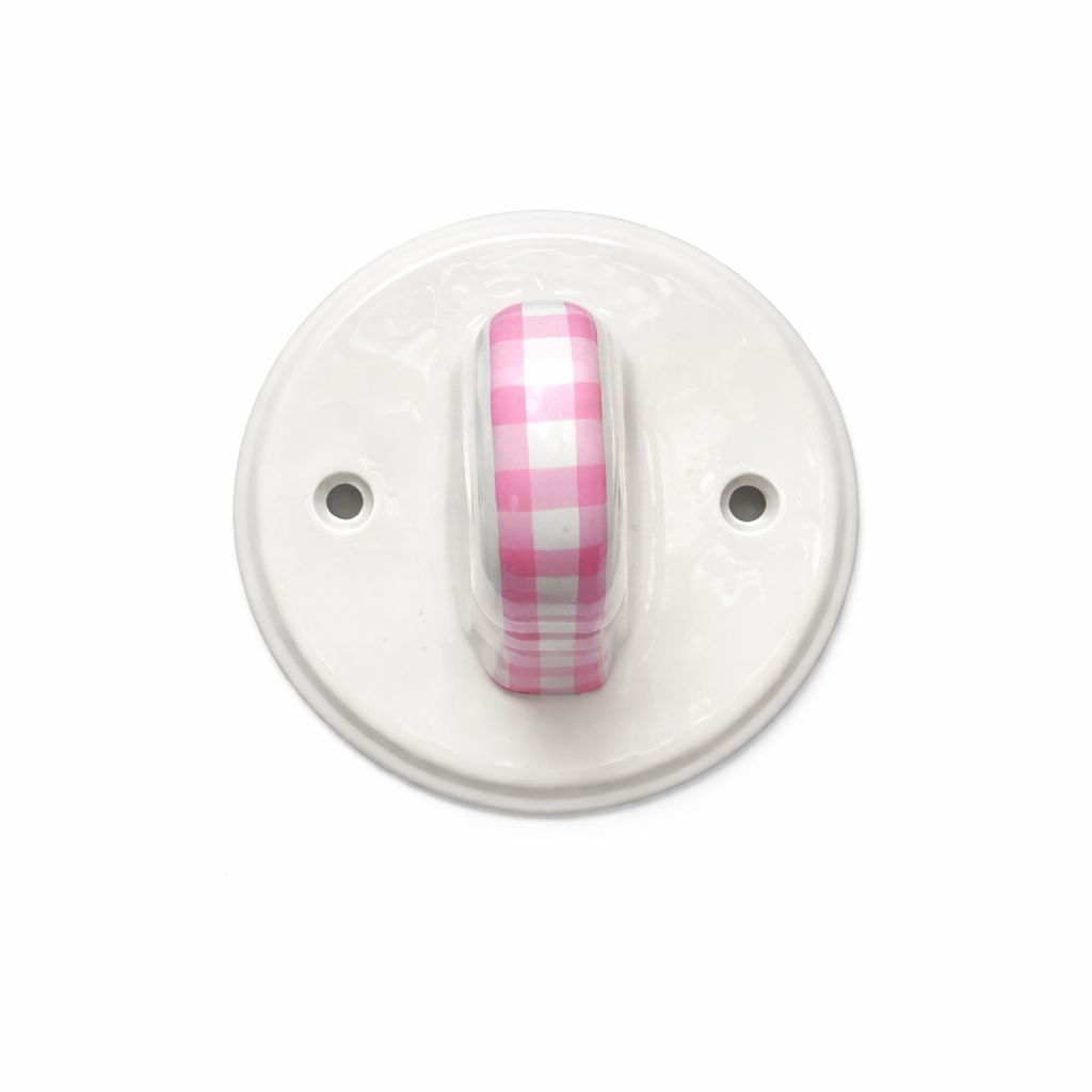 Bonito y calido juego de perchas porcelana blanca perfecta para un baño, dormitorio o incluso una entrada de cuadros vichy rosa, amarillo y verde.